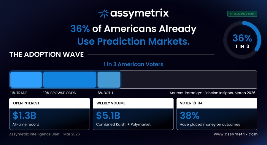 A Paradigm-Echelon Insights poll of 1,000 likely US voters revealed that 36% already use prediction markets in some form. Not planning to. Not heard of. Use. One in three American voters is actively engaging with prediction market platforms — either placing bets, browsing odds, or both.